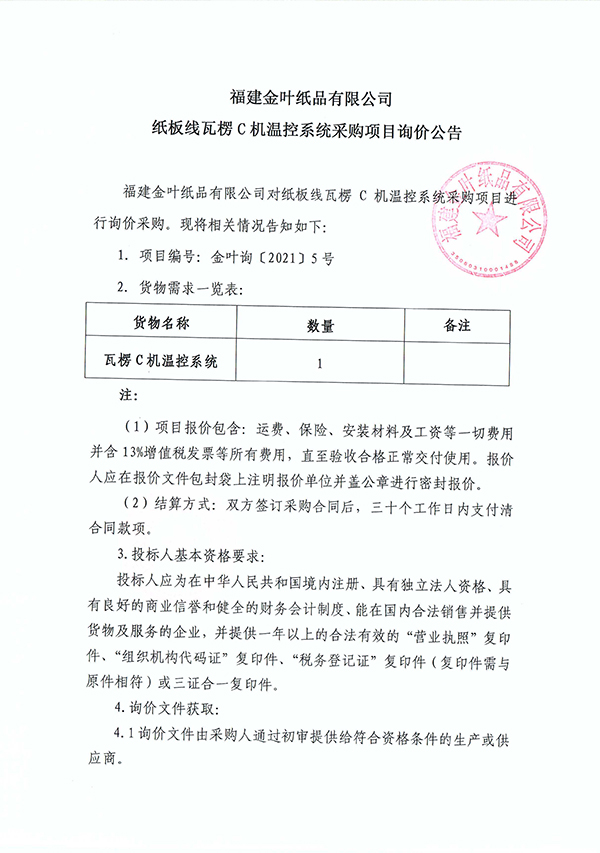 福建金葉紙品有限公司紙板線瓦楞C機(jī)溫控系統(tǒng)采購(gòu)項(xiàng)目詢價(jià)公告