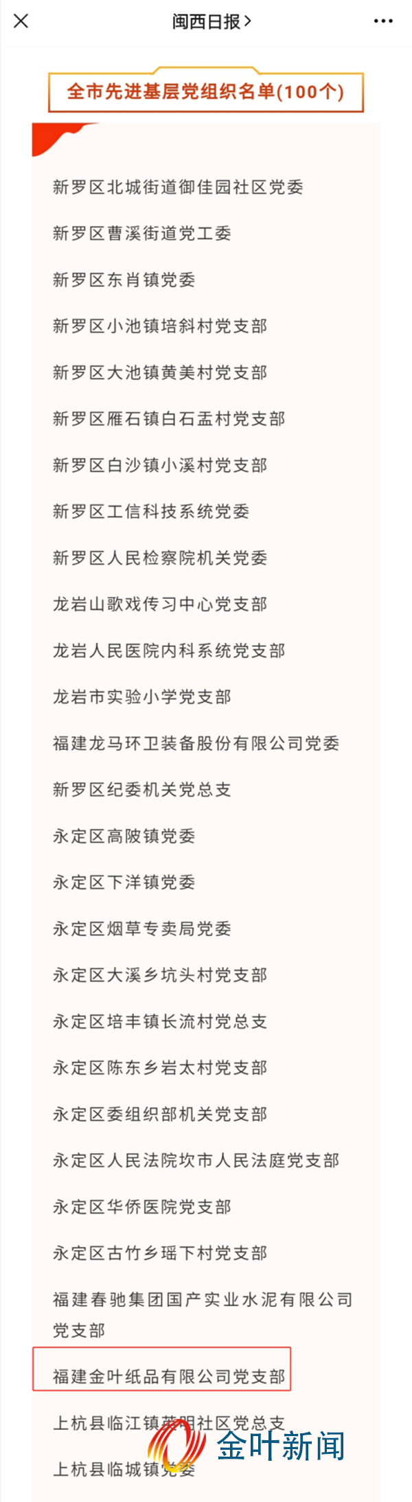 近日,龍巖市委發(fā)布了全市“兩先一優(yōu)”表彰對(duì)象名單,福建金葉紙品有限公司黨支部被授予“全市先進(jìn)基層黨組織”稱(chēng)號(hào)。