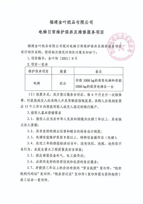 福建金葉紙品有限公司電梯日常維護(hù)保養(yǎng)及維修服務(wù)項(xiàng)目