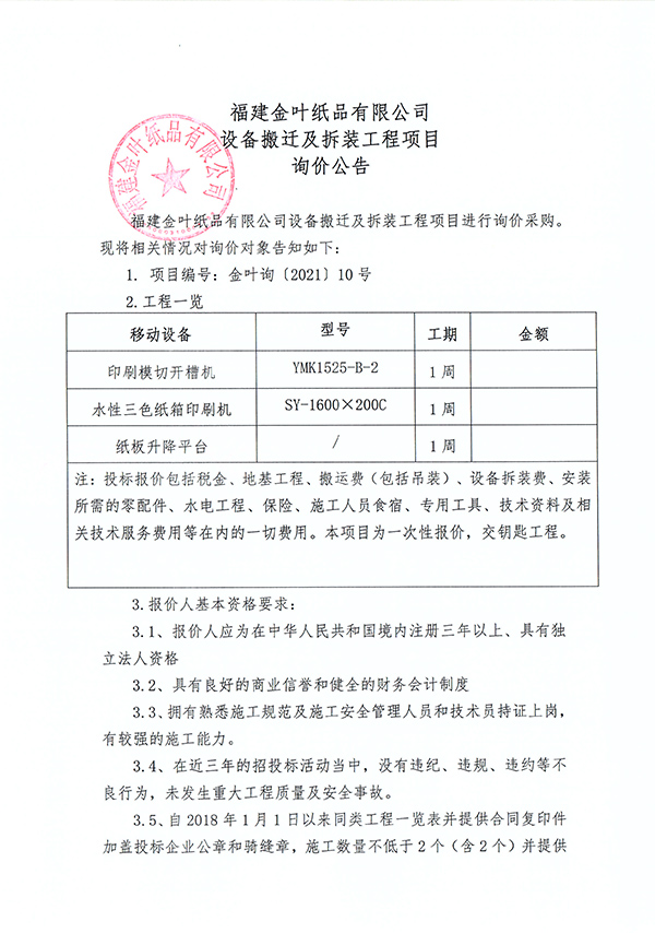 設備搬遷及拆裝工程項目詢價公告