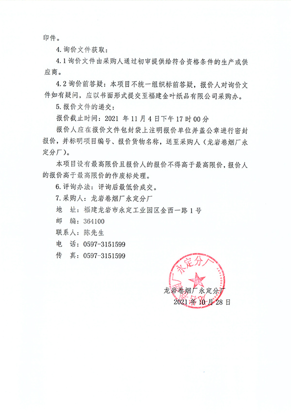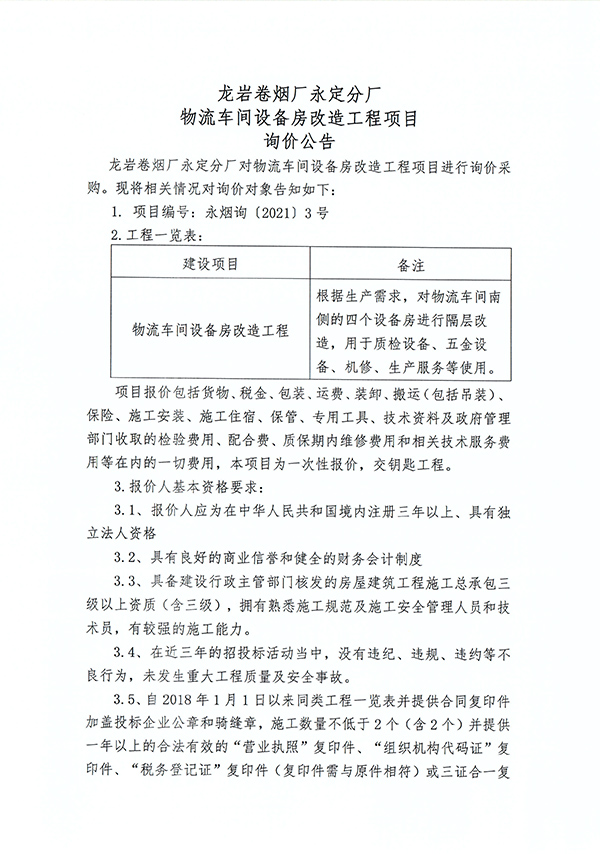龍巖卷煙廠永定分廠物流車間設備房改造工程項目詢價公告