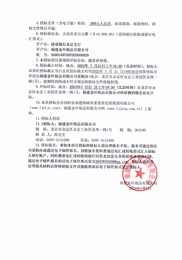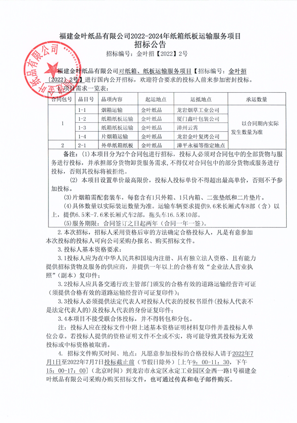 金葉紙品2022—2024年紙箱紙板運輸服務項目招標公告