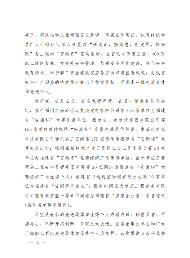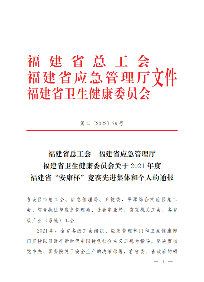 近日,福建省總工會、福建省應急管理廳、福建省衛生健康委員會聯合發布《關于2021年度福建省“安康杯”競賽先進集體和個人的通報》,龍巖卷煙廠永定分廠榮獲2021年度福建省“安康杯”競賽先進集體榮譽稱號。