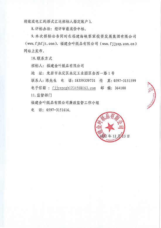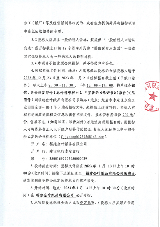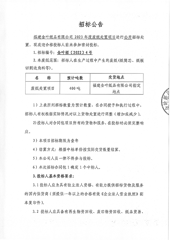 福建金葉紙品有限公司2023年度廢紙?zhí)幹庙?xiàng)目招標(biāo)公告