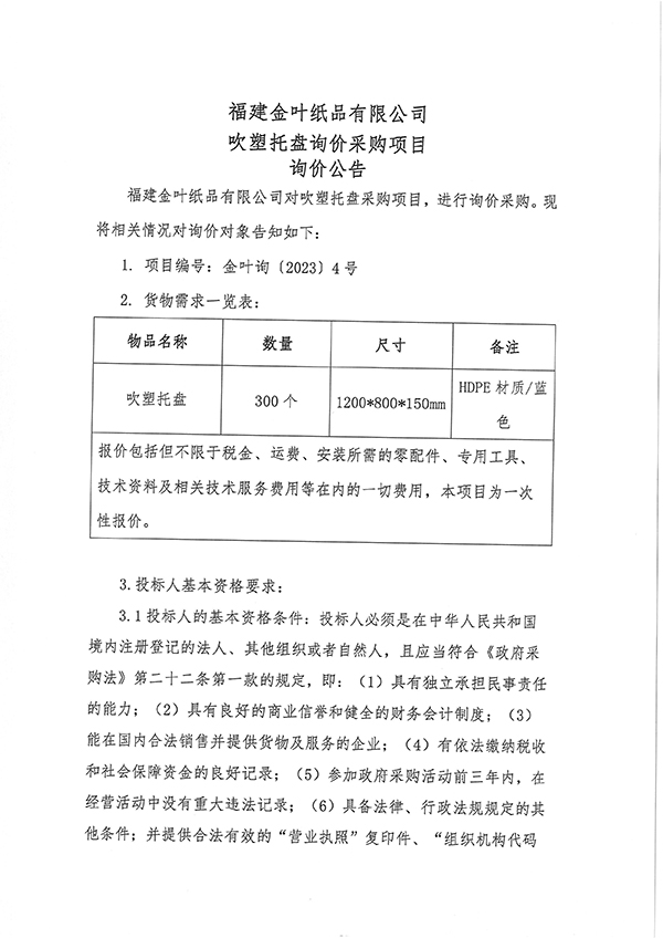 福建金葉紙品有限公司吹塑托盤采購項目詢價公告